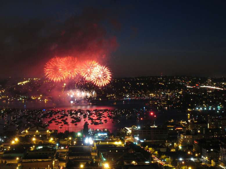 And then, the fireworks. You can also see in the photos the Space Needle. On the left is Puget Sound, where the first set of fireworks began. Then a helicopter circled Lake Union with a giant American Flag, and the main fireworks display there began.