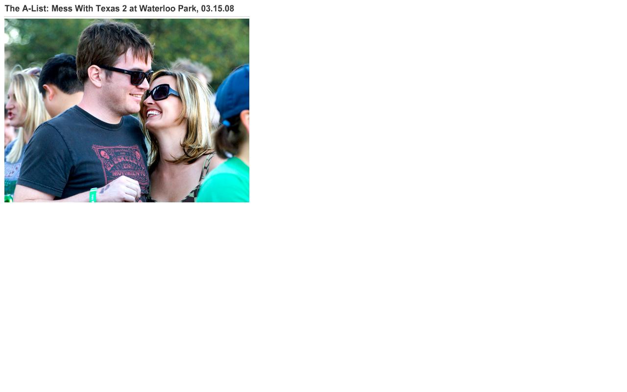 I took a ton of pictures and had a ton taken of me, due mostly to the gorgeous dress KD let me borrow. We made our way back to Waterloo for the night show. We saw Gil Mantera’s Party Dream, a little of the Yeasayers, Black Mountain, Islands, and The Breeders. Being not what we expected (a little too much of a downer), some of the crowd shifted to NOFX, while KD and I checked out Simian Mobile Disco and partied a little (that means I drank a lot of Tecate). JC and I made the sxsw-a-list. (It looks cute, but we were totally talking crap about something.) It was a pretty full afternoon.