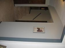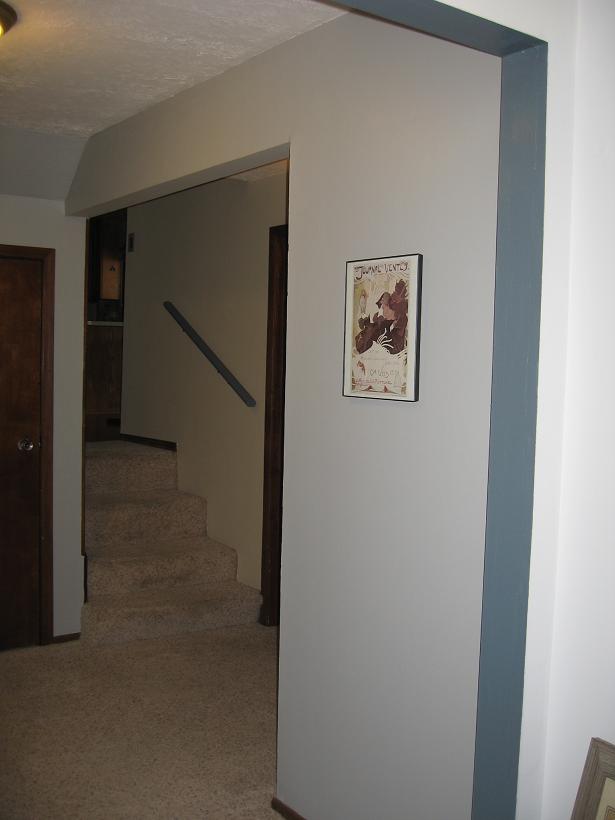 He sealed the trim and the windows and air vents and we cleaned the walls and the laundry room. We had to shut off the crappy fireplace and will have to get a new one. He FINALLY let me paint over the nasty maroon walls – since we couldn’t really agree on a final color we used three… One wall that is actually IN the basement living room is white now to match the rest of the basement, no idea why it WAS ever red. The hallway we used leftover grey, it may be temporary, but I like it. I made the upper half of the hallway match the kitchen since we had the paint, why not? We pulled down some wood that might have hung doors at one point and I painted the entryway to the basement living room and the hand rails, which were just plain wood before: