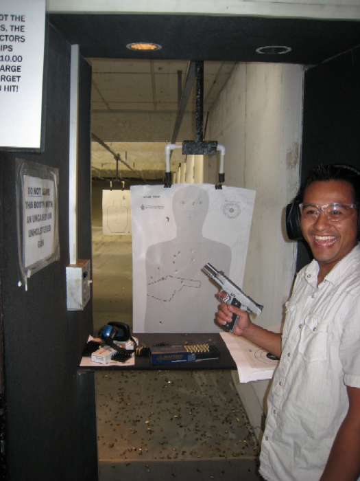 The guys there basically showed me how to load and cock the thing. And the rest, well, I was supposed to figure out myself. That was a little strange to me. MK and NN and MP were all there to guide me, but the first 9mm that I shot scared the crap out of me. Then the second time, the shell fell down my shirt. Those are hot. I also realized I kept closing my eyes and freaking out a little. So I stopped. I felt like a giant wuss. MK went to get me a smaller caliber gun. NN decided to let me shoot a bigger gun. I did it. It was hilarious to see MK come back with a .22 (smaller gun) and I’m in there shooting a .45 (bigger gun). He was confused.